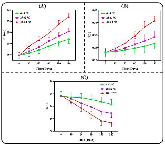 Since the environmental condition significantly affects the stability of pharmaceutical preparations during storage, this study was carried out to understand the ability of our developed PPN-LPHNPs to maintain their integrity in different temperature conditions. The results of the present study are depicted in Figure 6. As per the results, our developed PPN-LPHNPs exhibited excellent stability in 4 ± 1 °C, even after 6 months of the study, with only insignificant changes (p > 0.05) in the physicochemical parameters, i.e., PS, PDI, and %EE. Similarly, at a 25 ± 2 °C storage temperature, our developed PPN-LPHNPs also exhibited insignificant (p > 0.05) changes in PS and PDI, as well as in %EE after 6 months of study, and revealed acceptable stability at room temperature. However, at a 40 ± 2 °C storage temperature, significant (p < 0.05) changes were observed in the PS and PDI, as well as in %EE of PPN-LPHNPs, suggesting poor stability. A significant (p < 0.05) variation in these physicochemical parameters at 40 ± 2 °C was ascribed to the conglomeration of PPN-LPHNPs because of the degradation of the polymer at high temperatures [47]. Therefore, this study suggested that our developed PPN-LPHNPs should be stored at <25 °C to maintain their integrity as well as physicochemical parameters.