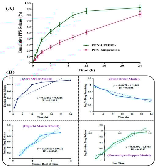Image representing (A) PPN release profiles from the optimized PPN-LPHNPs and PPN suspension and (B) various kinetic models for optimized PPN-LPHNPs to understand the mechanism.