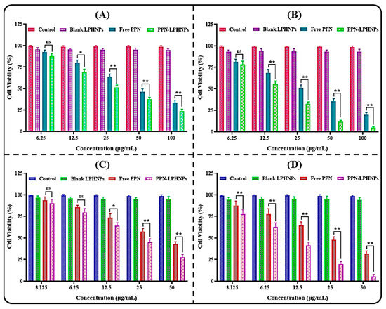 Image representing cytotoxicity assay of free PPN and PPN-LPHNPs against (A) MDA-MB-231 cells after 48 h, (B) MDA-MB-231 cells after 72 h, (C) MCF-7 cells after 48 h, and (D) MCF-7 cells after 72 h. Results are represented as a percent mean ± SD (n = 3). ns, * and ** represent non-significant, significant and highly significant differences between the two groups.