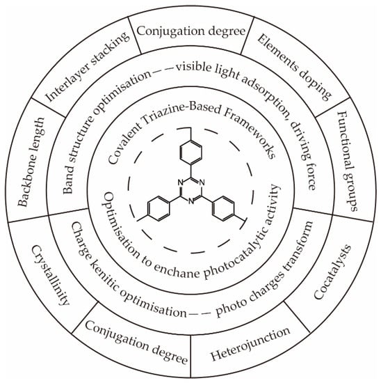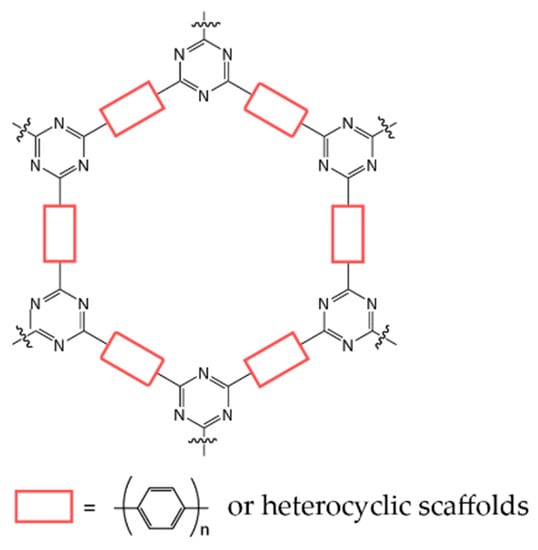 The first investigation of covalent triazine-based frameworks for photocatalytic hydrogen production attracted many researchers due to their structural tunability and inherent porosity [8]. Since then, the discovered high electron mobility of triazine-based frameworks allowed them to be a great block [9]. As shown in Figure 1, triazine-based frameworks (CTFs) are polymeric semiconductors composed of alternating triazine and benzene motifs. Compared with other widely researched polymeric photocatalysts such as graphitic carbon nitride (g-C3N4), conjugated heterocyclic polyamine, etc., CTFs (1) have a large π-conjugated structure, resulting in high chemical stability and high flexibility for the transportation of photocharges in the delocalized π bond [10,11]; (2) contain lone-pair electrons in the nitrogen sites of triazine rings, which can be easily excited to form an n⟶π transition and high-density photoelectrons [12,13]; and (3) by changing the monomer, are flexibly modified to increase the length of polymer backbones and functionalize them with substitutes, thus optimizing the band structure [14], as well as enhancing hydrophilicity [15] and the ability of hydrogen desorption [16].