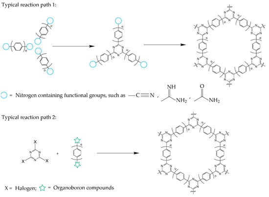 There are two main polymerization paths to synthesize CTFs, as shown in Figure 2. One is to synthesize triazine rings by cyano addition trimerization or amino dehydration trimerization. The other is to form the basic backbone via Suzuki coupling, Friedel–Crafts alkylation, and other reactions by triazine-containing monomers. Major CTFs have been synthesized by four reaction methodologies, including ionothermal synthesis [17,18,19,20], microwave-assisted synthesis [10,21,22], dehydration polycondensation [23,24], and solution polymerization [22,25,26,27,28,29]. Here, various strategies of CTF synthesis are discussed, including ionothermal synthesis, microwave, dehydration polycondensation, and solution polymerization.