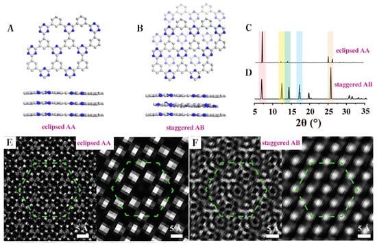 Two possible stacking arrangements with their (A,B) estimated structure, (C,D) calculated XRD, and (E,F) simulated HRTEM [31]. Note: (A,C,E) eclipsed AA stacking; (B,D,F) staggered AB stacking.