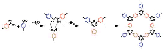 Dehydration of amidine [23] or amide [24] to form triazine require much lower activation energy than the trimerization of nitrile, thus reducing the polymerization temperature to 80–120 °C. The low reaction temperature is beneficial to prevent carbonization and, more importantly, functionalize the framework with thermolabile groups. A typical dehydration condensation route is shown in Figure 5 [23], using Cs2CO3 as catalyst and DMSO as solvent. A terephthalamidine molecule firstly reacted with an aromatic aldehyde to form a Schiff base. The reaction followed the nucleophilic addition reaction mechanism between primary amine and ketone, which was a basic chemical reaction widely utilized in the reaction to protect carbonyl groups. The Schiff base further reacted with another amidine molecule following Michael addition to form a triazine ring. A Michael addition reaction referred to a conjugated addition between an electrophilic conjugate electronic receptor and a nucleophilic electron donor. In the reaction, a formed Schiff base molecule was able to donate electrons to the conjugated double bond of the addition terephthalamidine molecule to form and remove -NH3 while generating a conjugated triazine motif via the rearrangement of electrons. The overall reaction time was around three days. The synthesized materials had an interlayer structure through holes and a relatively high surface area of ca. 700 m2 g−1. However, the crystallinity is relatively poor.