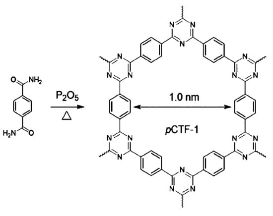 Terephthalamide is also utilized as a precursor for the synthesis of CTF-1. Under oxygen-free conditions and at 200 °C, P2O5 was able to dehydrate primary amide groups to form triazine motifs, as shown in Figure 6 [24]. The dehydration of amide was also a classic chemical reaction. In the reaction, electrons in the C=O double bonds were attracted by P atoms in P2O5 to form carbocations. Then, the lone-pair electrons of the nitrogen atoms were transferred to carbocations to remove hydrogen atoms and form C=N radicals. Triazine motifs were thus able to be generated via the trimerization of three C=N radicals. XRD results illustrated that the synthesized materials had a high degree of crystallinity and an eclipsed interlayer structure. The surface area was extremely high at 2000 m2 g−1, almost double compared to that of materials synthesized by ionothermal synthesis. Furthermore, the reaction temperature was only one-fourth of ionothermal synthesis; thus, carbonization hardly occurred during polymerization.
