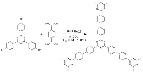 Solution polymerization is another approach to synthesize CTFs under a relatively low reaction temperature of 0–150 °C via chemical reactions such as cyano trimerization [22], Friedel–Crafts alkylation [26], and Suzuki coupling [29]. The typical procedure [22] of cyano trimerization is to dissolve both aromatic nitrile and TfOH in CHCl3, respectively. Then, two solutions are mixed dropwise at 0 °C under a nitrogen-saturated atmosphere. After 8–12 h of reactions, CTFs are able to precipitate from the solution. However, their degrees of polymerization and crystallinity are at a very low level [25]. In addition, the obtained materials are also thermally unstable. The Friedel–Crafts alkylation reaction route is shown in Figure 7 [28]. Anhydrous AlCl3 was used as catalyst and CHCl3 served as solvent. Triazine precursors were able to electrophilically substitute the H atoms in aromatic rings at 70 °C to realize the coupling of triazine rings and aromatic rings. However, due to the poor selectivity of the above substantial reactions, triazine rings coupled with aromatic motifs at random sites. Therefore, the CTFs prepared by the Friedel–Crafts alkylation suffered from a low degree of crystallinity and conjugation, seriously distorted layers, and low surface areas [26,27,28].