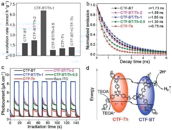 Photocatalytic activity for hydrogen evolution and efficiency of charge separation over a heterojunction photocatalyst of CTF-Th and CTF-BT [44]. (a) Photocatalytic activity for hydrogen evolution; (b) time-resolved photoluminance; (c) photocurrent responses and (d) illustration of the facilitated charge-carrier separation across the covalently interconnected molecular heterostructure.