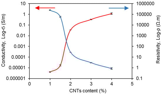 - The percolation threshold of these sensors was approximately 2% as the conductivity drastically increased between 1 and 2% CNTs content. Therefore, the C0.5 specimens with 0.5% CNTs showed no conductivity at all.