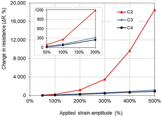 - The C1 and C1.5 sensors, with 1 and 1.5% CNTs contents, showed a complete loss of electrical paths at the applied strain amplitudes of 50% and 200%, respectively, since their CNTs content was less than the percolation threshold of these sensors.