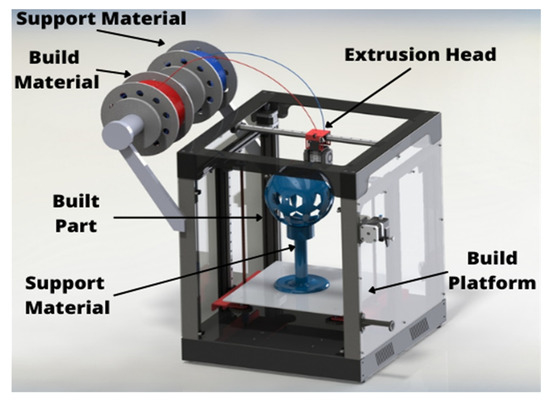 Additive manufacturing (AM) is a set that comprises a wide range of rapid tooling (RT) techniques and focuses on the production of complex geometries in an efficient way. It is a type of 3D printing which reduces time and is highly cost efficient. AM is a layered manufacturing technique which is an advancement in rapid prototyping (RP) production. It is a non-conventional method of production that eliminates the traditional manufacturing elements such as tools, machining process, jigs, and fixtures [1,2]. AM techniques such as fused deposition modeling (FDM) have their application in our day-to-day life. FDM is used in industries such as aerospace, automobile, medical, toy, construction, and marine engineering [3]. The FDM technique is a fast, inexpensive, clean, and safe method and fabricates the product in layer-by-layer deposition [4]. It is an integrated technique of RP and computer aided design (CAD) which provides flexibility to use various shapes and materials while achieving desired properties [5,6]. In FDM, the desired material is softened and put into the liquefier that melts the material and then pushed out through a nozzle to form the product as shown in Figure 1. The machine (liquefier) moves and the required shape is achieved by depositing the extruded material [7].