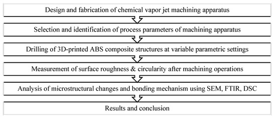 An optimization study was performed for this research to rule in the most suitable parameters for the results. This paper complied with the Taguchi technique. Acetone was applied as a surface enhancer to increase efficiency and smoothening of the treated surface. The drilling operations with acetone required a parametric evaluation of the final result. The result of this experiment allowed us to draw a conclusion on the effects of acetone vapor jet drilling on 3D-printed materials for circularity and surface finish. Methodology of the complete process is as shown below in Figure 2.