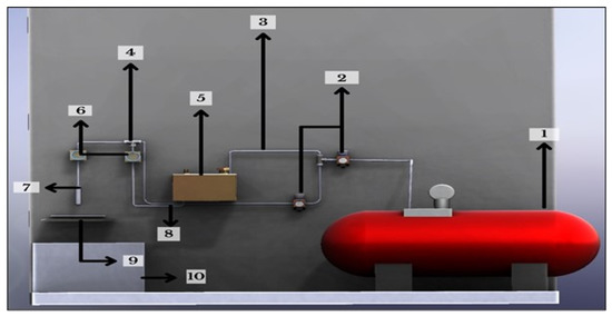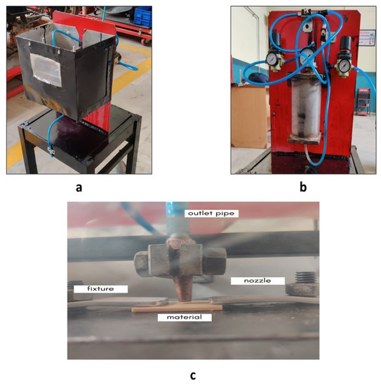 For the present study, experiments were performed on a set-up of chemical vapor jet machine designed in-house. The machine was sectioned in two majors as shown in Figure 3a–c, of which the control flow part was the first section that comprised the compressor, mixing chamber, and gauges. The second part was called the work station section and was a buildup of control valves, nozzle, and reservoir. A high-pressure vapor of air and acetone mixture was ejected which varied as per the operating conditions of the particular experiment with the help of the flow control valve. Stand-off distance could be varied with the adjustable worktable which could be measured with the help of the filler gauge, whereas the pressure of compressed air could be adjusted with the pressure valve and measured with the help of the pressure gauge mounted on the set-up.
