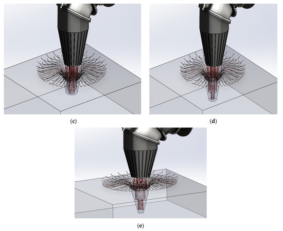 SEM analysis, also known as scanning electron microscopy, is a method of image magnification to carry out the analysis of any material. This analysis provides data on the failures, deformations, and damages that crept in the material during various machining processes [33,34,35,36,37,38,39,40,41,42,43,44,45,46,47,48,49,50,51,52,53,54,55,56,57]. Operations such as turning, milling, and drilling carried out on a material damages the surface and internal structure, which is analyzed with SEM analysis. In our study, SEM analysis was performed on a workpiece which was processed for durations of 20 s, 50 s, or 80 s of chemical vapor jet drilling while keeping pressure at 4 bar, stand-off distance at 2 mm, and flow rate at 16 mL. SEM analysis shows the highly magnified pictorial representation of the material which makes it easier to figure out the changes, surface roughness, and the circularity of the experimental data. In acetone vapor jet drilling used in our research, the images obtained from the SEM data as shown in Figure 4 allowed us to conclude that the rate of material removal was directly proportional to the time of drilling operation. If the operation was performed for longer durations, the removed material was higher in quantity. The depth as obtained from the data was 0.27 mm of material removed for every 20 s of operation. In the experimentation, the ABS material used as workpiece was of 2.5 mm of thickness. Wave-like patterns were introduced on the surface after the initial 20 s of operation as shown in Figure 10a. The depth was 0.27 mm for the first operation performed for 20 s, 1.38 mm after the 50 s of drilling operation, and 2.20 mm after the final operation of 80 s. In the second operation, the depth of the cut was clearly visible and after the final operation, the surface of the material could be seen more smoothly and clearly with the circularity of the cut being rounder and finer. SEM analysis provided data on circularity of the hole. The width and depth of the cut after the 20 s operation was 1.945 mm and 2.127 mm, respectively. Similarly, for 50 s of operation, the circularity of the hole was much more evenly distributed with a width of 2.177 mm and a cut depth of 2.087 mm. In the final stage of 80 s of operation, a width of 3.035 mm was observed along with a depth of 3.016 mm. The circularity for the 80 s operation was better than the other optimization.