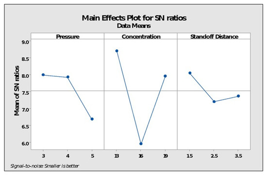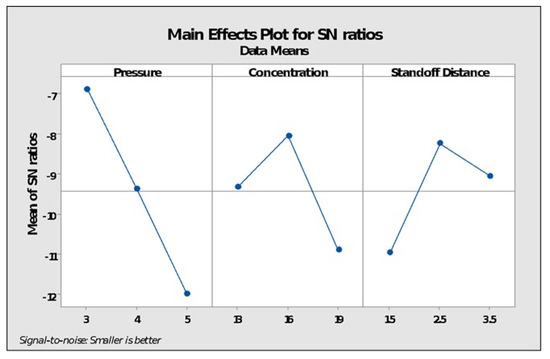 Figure 8 displays the factor effects on the SN ratio vs. different values of each input parameter for the change in circularity. It is clear that when the pressure rose from three to four bars, the SN ratio declined noticeably; further, pressure increase resulted in a significant decrease in the SN ratio. Furthermore, as the flow rate of acetone vapors increased from 13 to 16, the SN ratio degraded dramatically before rebounding with an additional flow rate increase. Correspondingly, a significant change in the SN ratio was detected with an increase in stand-off distance from 1.5 mm to 2.5 mm, although modest changes were observed again with further improvement. Response of circularity and SN ratio with respect to input variables is shown in Table 8.