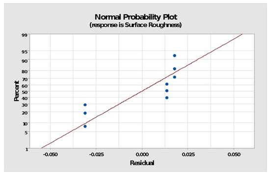 The normal probability plots of residuals in Figure 7 show that the points for output parameters, i.e., surface roughness, often form straight lines, indicating that residuals are normally distributed. If the points deviated from a straight line, the normalcy assumption might have been considered invalid. Thus, normally distributed data demonstrate the usefulness of the Taguchi technique in creating strong designs with few errors while running fewer experiments, as discovered by earlier researchers [21,22,23,24,25,26,27,28,29,30,31,32,33,34,35].