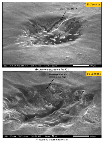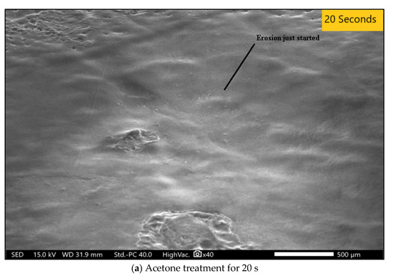 (a) 20 s, (b) 50 s, and (c) 80 s. Material removal SEM images after treatment with acetone.