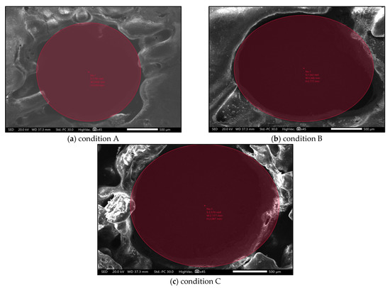 Figure 10a reveals that after 20 s of acetone treatment, the material removal was significantly reduced. There was no significant change and the surface was quite rough. Figure 10b shows that the effects were enlarged and could be seen because the duration of the acetone treatment was increased to 50 s. The material removal and the depth of the cut was greater as shown in Table 11. For the final analysis, SEM images were taken for experimental condition A, B, and C shown in Figure 11. After comparison of Figure 10a–c, it can be clearly seen that condition A, the least level of all the input variables, provided the best circularity result which was also verified from circularity response values. However, condition B provided the poorest circularity result.