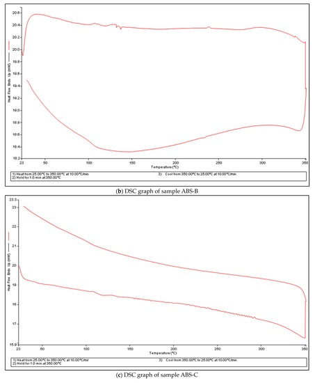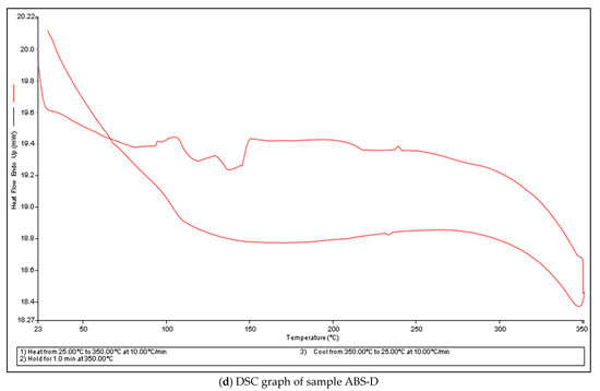 DSC, differential scanning calorimetry, is a thermal analysis method of changes in the material due to changes in the heat and temperature. This method works on the principle of effects due to heat in and out, that is, the heat absorbed and emitted from the material, and the changes are then observed under the controlled temperature program. The observations are made on the pattern of changes in the physical properties with respect to time and temperature. The changes in the melting point and crystallization point are measured along with similar ranges. DSC measures the heat effect and changes with reference to a standard material. In our experimentation, the material underwent a three-level heating and cooling process as standardized for the DSC method [55,56,57,58,59,60,61,62,63]. The three-level process involved heating at room temperature from 25 °C to 350 °C at a rate of 10 °C per minute as shown in the Figure 12a–d. In the second level of the process, the material was maintained at the temperature of 350 °C for 1 min, and in the final level of DSC, the material was cooled at a rate of 10 °C from the temperature of 350 °C to 25 °C. The materials that we used were samples of ABS, namely ABS-A, ABS-B, ABS-C, and ABS-D as descripted in Table 12.