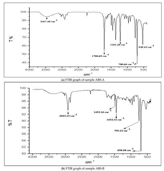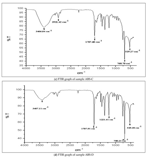 A material if passed through the electromagnetic spectrum either absorbs the spectrum or lets the spectrum pass through it. In FTIR, the infrared spectrum absorption or emittance decides the presence of groups in various materials. The spectroscopy concludes the amount of transmittance which further evaluates the amount of different functional substances and groups present. This experimentation was set up on Perkin-Nicolet Nexus 470. The basic principle behind FTIR is the infrared transmittance and emittance through the materials. Lights of various wavelengths and spectra are passed through the material. The materials then, as per their structure and properties, absorb or emit some or all of the light. These data were recorded and analyzed using the information presented in Table 14 below. The range of the FTIR spectrum was about 400 cm−1 to 4000 cm−1. The data revealed that high absorption of the light led to the presence of a high number of bonds in the material. FTIR analysis was depicted graphically and the curves of the graphs were used to conclude the data (Figure 13). The curve represents various wave numbers and the transmittance of the light through the material at specific wave numbers.