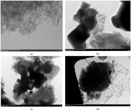 The TEM study (Figure 2) revealed the difference in the microstructure of the HKUST-1@BPS composites synthesized in the MW-fields and dispersion of the HKUST-1 particles located in them. Sample 1, synthesized by grinding together all the reagents and using BPS loading of 3.0 g, has relatively small HKUST-1 nanocrystallites, with sizes of approximately 10 to 20 nm embedded mainly inside the BPS matrix and some bigger HKUST-1 particles with sizes of 500 to 1000 nm located on the surface (Figure 2b).
