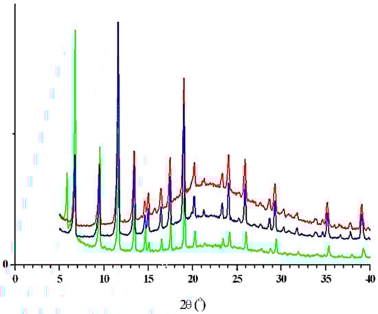 The combined presentation of the XRD patterns of the 1 (green), 2 (blue), and 3 (red) samples.