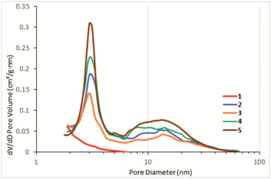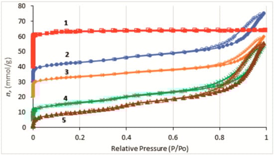 These data were obtained at 77 K using an ASAP 2020 Plus instrument (Micromeritics, Norcross, GA, USA). The specific surface areas were calculated according to the BET equation (ISO 9277). The total pore volume was evaluated at p/p0 = 0.99. The distribution in sizes of mesopores was calculated from the desorption branch according to the method of Barrett, Joyner, and Halenda (BJH). The cumulative volume at desorption in the BJH method at 2 nm was taken as the mesopore volume. The thickness of the adsorbed multilayer on the mesopore surface was taken into account. The micropore volume was calculated as the difference between the total pore volume and the mesopore volume. The micropore size distribution was calculated according to the Horwath–Kawazoe model in assumption of a cylindrical shape of the pores [61].