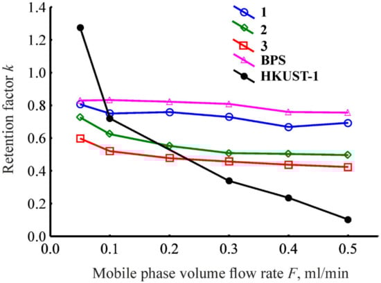 To study the accessibility of micropores of the HKUST-1@BPS materials under conditions of HPLC towards molecules of an adsorbate, the benzene retention dependences on the mobile phase flow rate were obtained. The tests were carried out at the constant eluent composition (99.5% of n-hexane and 0.5% of isopropanol) and temperature 35 °C. The retention times of benzene were measured at different eluent flow rates: 50, 100, 200, 300, 400, and 500 µL/min. The volume of the probe injected into the chromatographic system was 20 µL. We used the extremely dilute benzene solutions in the examinations of the liquid-phase adsorption mechanism. The volume fraction of benzene in a solution was 10−3. Thus, the liquid-phase adsorption was studied under conditions of extremely low degrees of the coverage of the adsorbent surface (the so-called Henry range). The column’s back-pressure in these tests was in the range of 5–59 bar.