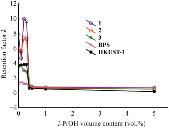 To understand intermolecular interactions between adsorbate molecules and active adsorption sites in the HKUST-1@BPS pores while changing the bulk liquid phase composition, the dependences of the retention factor on the composition of a mobile phase were measured. The impact of the mobile phase composition on the benzene retention on the HKUST-1@BPS adsorbents and the pristine HKUST-1 and BPS materials was studied as follows. Before HPLC measurements, the columns packed with HKUST-1@BPS, HKUST-1, and BPS particles were thermostated at 35 °C and rinsed with a mobile phase of different compositions and a volumetric flow rate F = 50 μL/min for 40 min. The retention times for benzene were obtained under these constant conditions and at the following volumetric ratios of n-hexane to isopropanol in the eluent: 100/0, 99.9/0.1, 99.8/0.2, 99.7/0.3, 99.6/0.4, 99.5/0.5, 99/1, and 95/5% (vol.). The column’s back-pressure in these tests was around 5 bar.