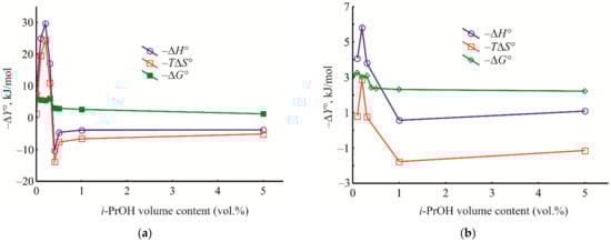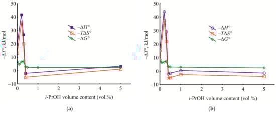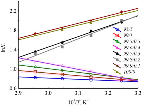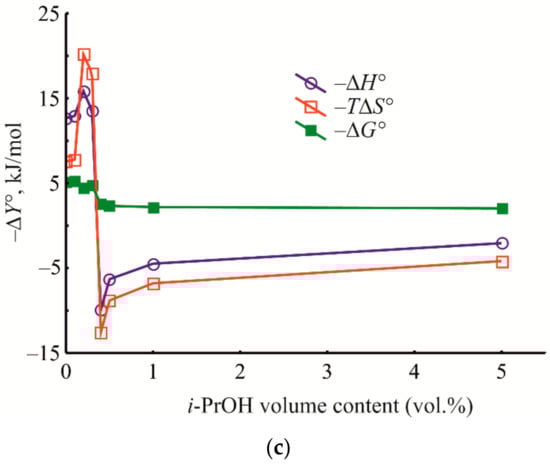 Using the retention factor, the values of the distribution constant (Kc), Gibbs energy (∆G°), enthalpy (∆H°), and entropy (∆S°) of the liquid-phase adsorption upon HPLC were calculated by the following well-known Formulas (3)–(5) [64]: