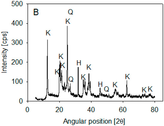 Ward’s Science kaolin particles were used. Its composition was determined by XRD analysis on a Bruker X-ray diffractometer, D8 Advance (Bruker, Billerica, MA, USA), using the 2020 ICDD (International Center for Diffraction Data) Powder Diffraction File database. The spectra showed that kaolin is mainly composed of halite and kaolinite (>10%) and some SiO2 (1–10%) (Figure 1). Volume-weighted particle size distribution (PSD) was obtained using a Microtrac S3500 laser diffraction analyzer (Verder Scientific, Newtown, PA, USA) and published in Jeldres et al. [25]. The data showed that 10% of the kaolin particles were smaller than 1.8 µm.