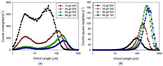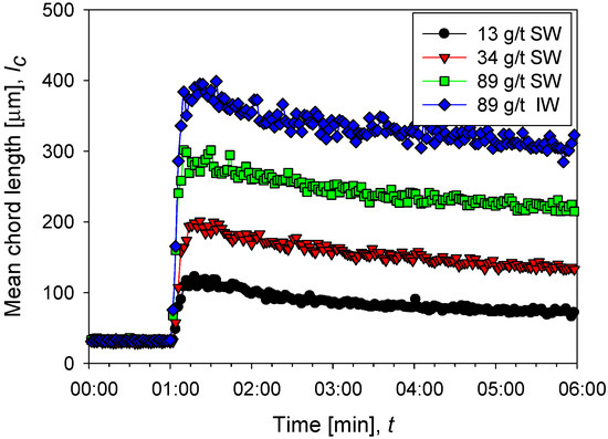 Figure 2 shows the flocculation kinetics of clay suspensions in seawater (high salt) at polyacrylamide doses of 13, 34, and 89 g/t and industrial water (low salt) at 89 g/t at a shear rate of 273 s−1. Once the flocculant is added, the growth of the aggregates is practically instantaneous, and it only takes a few seconds to reach a maximum size. Subsequently, shear fragmentation causes a continuous reduction in the size of the aggregates until reaching a stable size. The average size of aggregates shows an increasing trend with the doses studied; for example, at 13 g/t in seawater, a size peak of 115 µm is reached, while at 89 g/t the peak is at 300 µm. A saline system can favor or harm flocculation. The final result depends on the competition of two mechanisms propitiated by the presence of cations, that is, (i) better flocculant adsorption via cationic bridges and (ii) electrostatic shielding of the active sites in the flocculant, leading to polymer curling. The results in Figure 2 show better flocculation in industrial water than in seawater, indicating that the high concentration of cations in seawater causes a significant increase in polymer curling, limiting its ability to form hydrogen bonds and thus its effectiveness as a flocculant. Figure 3 shows unweighted and squared-weighted chord length distributions (CLD) for the kaolin suspension at 4 wt%, using seawater at polyacrylamide doses of 13, 34, and 89 g/t and industrial water at 89 g/t. The chosen mixing time is 55 s, just before applying an increase in shear rate.