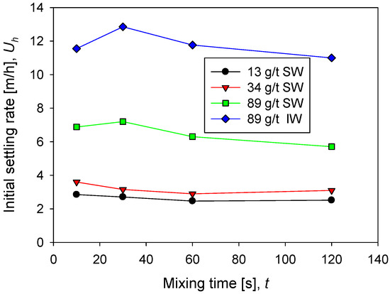 The sedimentation rate in industrial water is notoriously higher than in seawater, as shown in Figure 4 at 89 g/t of flocculant in both cases. This result is also consistent with the flocculation kinetics in Figure 2, which show aggregates with larger average sizes in industrial water. The particle size distributions in Figure 4 show that coarser aggregates are larger in industrial water than in seawater. In industrial water, the sedimentation rate shows a more pronounced maximum at 30 s.