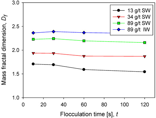 Figure 5 shows the behavior of the fractal dimension of kaolin aggregates as a function of the flocculation time at different doses of flocculant in seawater and in industrial water at the same shear rate. The fractal dimension of kaolin aggregates is not very sensitive to flocculation time; only at low doses of flocculant in seawater is a small decrease associated with a slight restructuring of the aggregates observed. This result is different in aggregates that come from mineral mixtures. For example, the fractal dimension of kaolin and quartz aggregates decreases with flocculation time, according to Leiva et al. [12]. At low flocculant doses in seawater, the flocs that form are small according to the flocculation kinetics (Figure 2) and the size distribution (Figure 3). Now according to their low fractal dimension (between 1.5 and 2), it is inferred that they are very fragile structures. This result is expected since the flocculant molecules are scarce, and therefore the probability of formation of bridges of any type is low. On the contrary, at high doses of flocculant in seawater, the flocs are large, and, in addition, according to their high fractal dimension (between 2 and 2.5), they have a resistant structure. This result is also expected because the greater the number of flocculant molecules, the greater the probability of forming interparticle bridges.