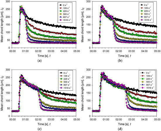 Evolution of the average size of aggregates of kaolin in suspensions with different doses of flocculant in SW and IW at a shear rate of 200 rpm (black dots) and after several increments of shear rate (color dots). The curves with increased shear show three stages, pre-flocculation (primary particles remain free), flocculation (particle size first increases sharply by aggregation and then decreases smoothly with time), and disaggregation (particle size decreases abruptly as shear is increased). (a–c) correspond to 13, 34, and 89 g/t of flocculant in seawater, respectively, while (d) corresponds to 89 g/t of flocculant in industrial water.