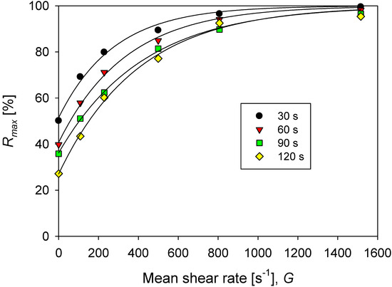 where is the maximum aggregate rupture percent and is the average size of the primary particles. The values calculated for aggregates at different conditions can be represented by Equation (8), which allows estimating the degree of rupture as a function of the agitation increments (ΔG). The results are shown in Figure 7.