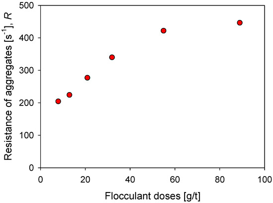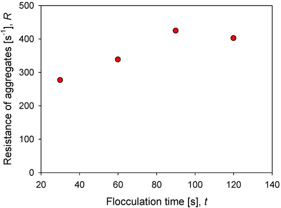 Figure 9 shows the impact of the flocculant dosage on the strength of kaolin aggregates in seawater after a flocculation time of 60 s. With 8 g/t of flocculant, a minimum resistance R of 203 s−1 is obtained, which increases monotonically with the dose until it reaches a value slightly higher than = 400 s−1 with 55 g/t of flocculant, and tends to settle after = 445 s−1 with 89 g/t of flocculant. The flocculant dose is a critical aspect in the formation of the aggregates since it determines the number of polymer molecules available in the suspension to join the particles. Therefore, for a fixed surface area, an increase in polymer molecules is expected to generate a greater number of particle–flocculant bonds or a more intricate particle network. This explains the increasing aggregate strength in Figure 9 with flocculant dosages increasing from 8 to 55 g/t. At higher doses, 89 g/t, the resistance does not change significantly despite having a greater number of polymer molecules. In this case, it should be considered that the large aggregates are more prone to breakdown, which limits the value of the resistance.