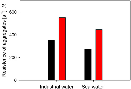 The resistance response of kaolin aggregates to different salinities was somewhat greater in the study by Jeldres et al. [25], whose experiments were carried out at pH 5.5. In contrast, in the present study, the experiments were carried out at pH 8, at which the kaolin particles are mostly anionic. At pH 5.5, in the work of Jeldres et al., kaolin particles in freshwater form aggregates by electrostatic attraction between cationic edges and anionic faces (giving rise to the well-known house-of-cards structure). However, if the ion concentration increases, the electrostatic shielding of the mineral surface reduces the number of edge–face bonds, and face–face type organizations prevail, which are more fragile, and also the efficiency of the flocculant is critically reduced by coiling. A pH of 8 does not favor edge–face bonds that provide resistance to the kaolin aggregates, and thus their resistance is somewhat lower than at pH 5.5. In the presence of seawater and at a pH of 8, on the one hand, salt bridges are activated that contribute to the resistance of the aggregates, and on the other, the flocculant chains are deactivated due to coiling; the resistance of the aggregates is the net effect of these two factors.