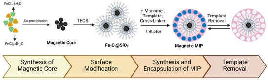 An MMIP is a combination of magnetic particles with an MIP. Magnetic particles widely used in the synthesis of MMIPs are Ni [], NiO [], γ-Fe2O3 [], and Fe3O4 [,,,]. The most commonly used magnetic particle is Fe3O4 due to its low toxicity and easy fabrication []. MMIP synthesis consists of several main steps: the first is the synthesis of the magnetic nanoparticles; the second is the modification of the magnetic core-shell surface; the final step is the synthesis of the MMIP itself []. A schematic of MMIP synthesis is presented in Figure 1.