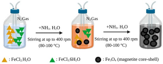 Magnetite (Fe3O4) nanoparticles are generally used as magnetic materials in the world of medicine and pharmaceuticals due to their biocompatibility, biodegradability, low toxicity, magnetic properties, and easy preparation. This magnetite preparation can be conducted by various techniques, namely co-precipitation, solvothermal/hydrothermal, oxidation method, flow injection synthesis, supercritical fluid method, microemulsion, thermal decomposition, chemical vapor deposition, electron beam lithography, microwave assisted, and sonochemical []. However, among all these Fe3O4 nanoparticle preparation techniques, the most commonly used techniques for magnetic preparation of MMIP nanoparticles are co-precipitation and solvothermal/hydrothermal techniques [,]. The first step in the manufacture of MMIPs is to make magnetite, with the final product being in the form of iron (II, III) oxide or ferrosoferric oxide (Fe3O4) []. The magnetite is obtained using co-precipitation (as shown in Figure 2) of hydrated iron (II) chloride (FeCl2·H2O) and iron (III) chloride (FeCl3·6H2O). Iron in the higher oxidation state can also be gained from iron (II) sulphate (FeSO4·7H2O). Both reactions are performed in sodium hydroxide or ammonia solution at the temperature range of 80–100 °C [,,]. This co-precipitation is carried out with nitrogen gas flowing continuously while stirring is carried out at up to 400 rpm. A black precipitate will be obtained as the end product of the reaction, which is then collected using an external magnetic field. The final product is then washed with ultrapure water until the pH of the rinse water is neutral. In the final step, the black precipitate is dried for 24 h at 60 °C [].