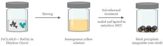 The synthesis of the magnetic cores can be performed using the solvothermal method, as shown in Figure 3, following Shao et al. (2012). The procedure involves dissolving FeCl3·6H2O and sodium acetate in ethylene glycol with vigorous stirring. A homogeneous yellow solution is produced, which is then transferred to an autoclave, sealed, heated at 200 °C for 8 h, and then cooled to room temperature. The product of the reaction is black magnetite particles, which are then washed several times with ethanol and dried at 60 °C for 12 h [].