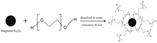 After obtaining Fe3O4 magnetite, it was then coated with a SiO2 film by hydrolysis with tetraethyl orthosilicate (TEOS). The procedure used is as follows: Fe3O4 is evenly dispersed in 80% ethanol and ultrasonicated for 30 min, with ammonium hydroxide and TEOS added dropwise to the solution. Then, the mixture is stirred for 12 h at 500 rpm at 45 °C. The Fe3O4@SiO2 produced after stirring is collected with the help of an external magnet and then washed several times with 95% ethanol and dried for 12 h at 60 °C []. This modification of the magnetite surface aims to protect magnetite from the oxidation or dissolution that can occur in the following stage of the MMIP formation reaction [] and modification with SiO2 can also increase the dispersion of magnetite in water and prevent agglomeration []. In addition, the presence of the SiO2 shell allows further modification of the magnetite. An example is the addition of a modification with 3-(trimethoxysilyl) propyl methacrylate (MPS) (Fe3O4@SiO2@MPS), which imparts a vinyl group to the magnetite surface, providing a binding site for further polymerization []. Graphene oxide (Fe3O4@SiO2-GO@MPS) [] and triethylamine (Fe3O4@SiO2-CH=CH2) [] can be an option to provide binding sites on the SiO2 shell. SiO2 is the most frequently used layer [], but several other layers can also be used. Polychloromethylstyrene (PCMS) can protect the magnetic core-shell from corrosion under acidic and basic conditions [], oleic acid (OA) can increase hydrophobicity [], and Chen et al. (2012) also increased hydrophobicity by using polyethylene glycol (PEG) []. Figure 4 shows the surface modification by PEG.
