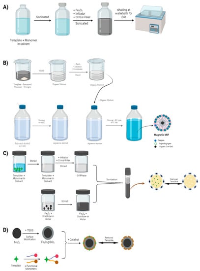 (A) Precipitation polymerization; (B) suspension polymerization; (C) emulsion polymerization; (D) sol–gel polymerization.