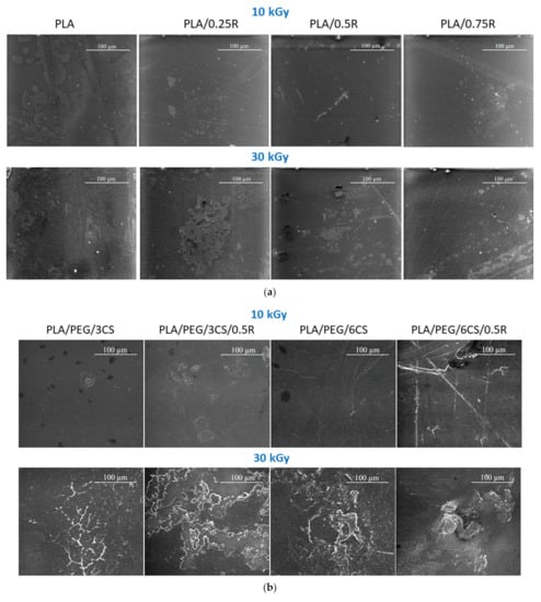 The effect of γ-irradiation on the surface morphologies of the PLA-based samples was examined using SEM. In the SEM images of Figure 1a, the surface morphologies (at a scale of 100 µm) of PLA and PLA/R blends before and after irradiation with doses of 10 and 30 kGy, respectively, were shown. As it is observed, the surface of the samples’ remains almost smooth without major damage after irradiation with a dose of 10 kGy, in accordance with literature results [40,41]. This aspect remains unchanged also for a 20 kGy irradiation dose. At a dose of 30 kGy, the surfaces of all samples are heterogeneous, but cracks are not present. Similar observations were found in the case of plasticized samples. The addition of CS in the composition of biocomposites’ induced some modifications at their surface with the increase in γ-dose, mainly at 30 kGy (Figure 1b). The heterogeneity of the surfaces’ also increased with increasing CS content and irradiated dose—Figure 1b, showing scratches and minor cracks.