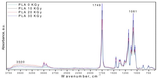 Hence, no changes were observed in the chemical structure of the γ-ray-treated PLA sample, irrespective of applied γ-irradiation doses (10–30 kGy)—Figure 2. PLA shows characteristic stretching frequencies for C=O, –CH3 asymmetric, –CH3 symmetric, and C–O, at 1746, 2995, 2946, and 1080 cm−1, respectively. Bending frequencies for –CH3 asymmetric and –CH3 symmetric were identified at 1452 and 1361 cm−1, respectively. In the region of 1600–1900 cm−1, the band located at 1758 (1749) cm−1 assigned to ester groups decreases as a function of radiation dose; therefore, the irradiation of PLA occurs due to oxidation reactions of ester groups leading to formation of hydroperoxides or alcohols, the hydroxyl groups being present in the region 3300–3600 cm−1 as a large absorption band centered at 3500 cm−1 and its intensity increases with radiation dose—see Figure 2.