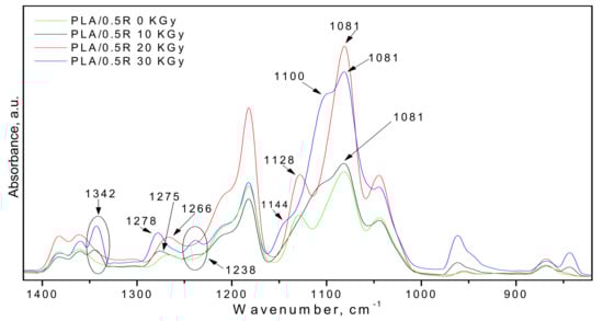 Comparing the spectra of the non-irradiated samples of PLA/R films (PLA/0.25R, PLA/0.5R, and PLA/0.75R) with those γ-irradiated, some significant modifications occur after gamma irradiation, especially in the 1400–800 cm−1 region—Figure 3. Thus, after sample irradiation, two new absorption bands appear at 1342 and 1238 cm−1 which are assigned to the CH and CH2 bending twisting vibrations, respectively. Moreover, in the spectra of non-irradiated samples, the band from 1128 cm−1 (attributed to the CH3 rocking or C–O stretching) was shifted to 1100 cm−1 and changed in a shoulder which is stronger, as evidenced in the case of the samples irradiated at a dose of 30 kGy (blue line).