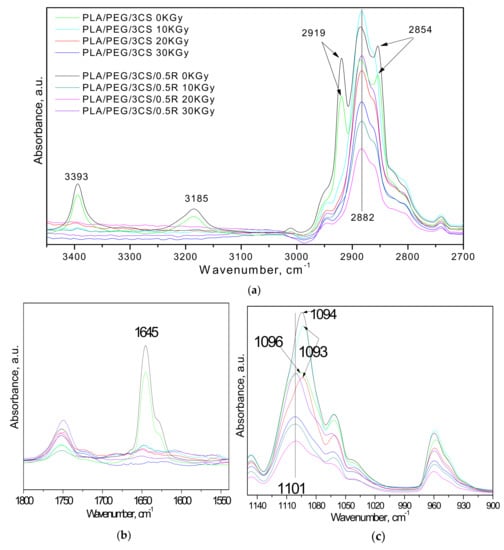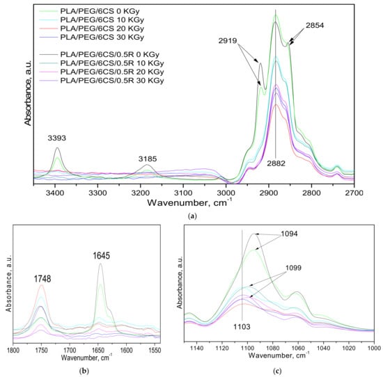 FT-IR spectra of the PLA/PEG/3 CS with/without rosemary extract powder (R), at 10, 20, and 30 kGy irradiation doses, respectively, in comparison with the non-irradiated ones in different spectral regions of: (a) 2700–3500 cm−1, (b) 1500–1800 cm−1, and (c) 900–1150 cm−1.