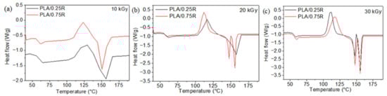 DSC curves of the PLA/0.25R and PLA/0.75R samples irradiated at 10 (a), 20 kGy (b), and 30 kGy (c). Recorded in the 2nd heating run.