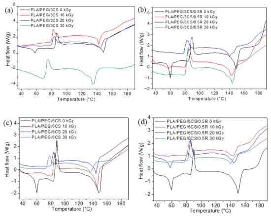 DSC curves for of PLA/PEG/3CS (a), PLA/PEG/3CS/0.5R (b), PLA/PEG/6CS (c), and PLA/PEG/6CS/0.5R (d) samples irradiated at 10, 20, and 30 kGy in comparison with non-irradiated samples. Recorded in the 2nd heating run.