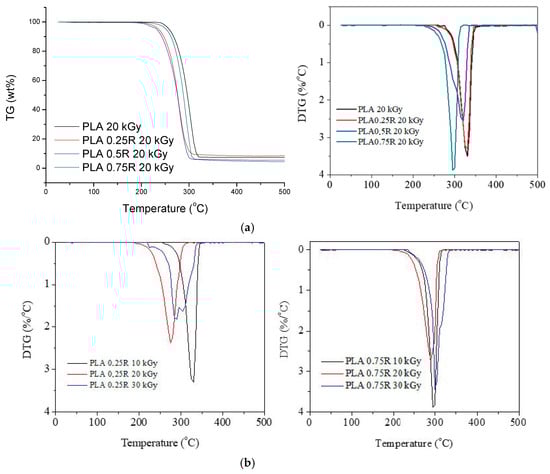 TG/DTG curves of the PLA/R blends with different R content irradiated with a gamma dose of 20 kGy (a); DTG curves of the PLA/0.25R and PLA/0.75R at different gamma irradiation doses (b).