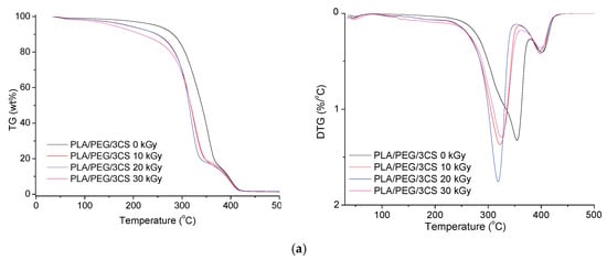 The TG/derivative of TG (DTG) curves of PLA/R blends and PLA/PEG/CS/R biocomposites irradiated at three doses (10, 20, 30 kGy) are shown in Figure 8 and Figure 9, respectively. It can be observed that the characteristic degradation temperatures (Table 3) decreased after gamma irradiation, the results being in accordance with the DSC data.