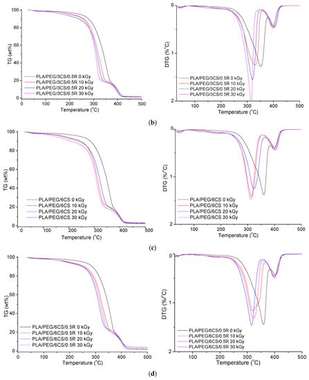 TG (left) and DTG (right) curves of the PLA/PEG/CS (a,c) and PLA/PEG/CS/R (b,d) non-irradiated and irradiated at 10, 20, and 30 kGy.